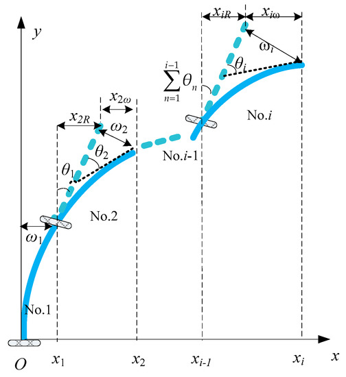 In a geometric coordinate system, the fixed end coordinate of the first beam is O (0, 0) and the tangent direction is y-axis, as shown in Figure 2.