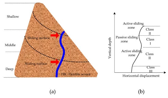 The internal horizontal displacements of the slope can provide information on the below-ground movement and can serve to detect the position of the sliding surfaces, which are crucial to understand the possibility of the occurrence and mechanism of landslide events. It is necessary to lay flexible sensors in the places where deformation may occur according to the actual geographical location to effectively monitor the internal displacement of the slope. In the process of FBG flexible sensor placement, firstly, drilling is carried out in the slope, and the casing with the same material of flexible substrate is embedded in the borehole. Then, the outer periphery of the casing is grouted with cement mortar. Next, the FBG flexible sensor is placed in the casing [36,37]. With the protection of the casing, even if the shear strains around the FBG flexible sensor are large, this will not cause the plastic deformation of the whole sensor structure. Meanwhile, it avoids direct contact with the backfill, which may cause potential damage to the FBG sensing points. The casing and flexible substrate are the same material, which can achieve a better mechanical matching. The FBG flexible sensor is installed vertically in a slope borehole and traverses the potential sliding zones to the bottom (see Figure 3a). The bottom of the flexible sensor is considered fixed, and the deformation sensing mechanism is similar to that of a cantilever beam. The shear force of the internal soil is altered as a result of rainfall, groundwater, earthquake load, overload and other factors, which eventually trigger the landslide. According to the thickness of the landslide, it can be divided into a shallow landslide, middle landslide and deep landslide. The deformed shapes of the flexible sensor have diversified characteristics because multiple sliding surfaces may occur at different depths of the slope, and the displacements of the active sliding zone and passive sliding zone are different. As shown in Figure 3b, the bottom displacements of the slope are basically unchanged, and the displacements in the active sliding zones are larger, while the displacements in the passive sliding zone are smaller. It is found that although the flexible sensor has many different bending shapes, they can be categorized into three classes based on the strain increments at the sensing points. In Class I, the strain increments at the sensing points are positive, while the negative strain increments at the sensing points are Class II, and the strain increments hardly changed in Class III. The displacements of the measuring points are calculated based on the strain values measured by the FBG sensing points. If the strain value of the sensing point remains untouched, the beam where the sensing point is located will not produce a deflection displacement. Thus, only the strain values of the sensing points at Classes I and II are corrected, but the strain values of Class III are not corrected. A clustering method based on strain increments has been proposed according to the above analyses.