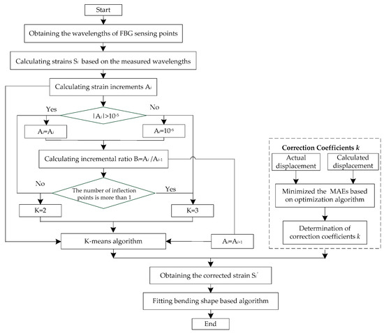 In this paper, we proposed a segmental correction method based on strain increment clustering with the characteristics of self-correction displacement profile reconstruction, which had the ability to identify and correct deformation segments automatically for different bending shapes of the flexible sensor. Specifically, we calculated the strain increments at sensing points and extracted them as eigenvalues to be clustered. Then the clustering algorithm was employed to cluster the strain increments so that the deformation segments with different bending shapes of the flexible sensor could be identified automatically. The correction coefficients of the deformation segments were determined by calibrating the typical bending shapes of the sensor in the measurement of the slope displacement profiles, and the optimization algorithm was adopted to determine their optimal values. The remainder of the paper was organized as follows: in Section 2, the correction method of shape sensing was explained in detail. Then, in Section 3, a finite element simulation was conducted to verify the displacements sensing effects. Next, we conducted an FBG flexible sensor fabrication, experiment and analysis in Section 4. Finally, Section 5 presents the concluding remarks.