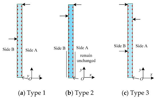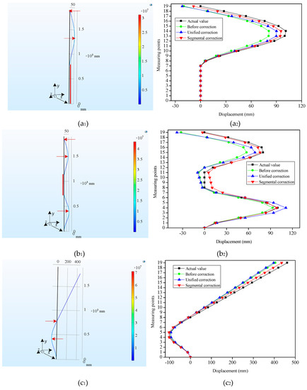 A displacement constraint was fixed on the bottom of the slender plate, and three different types of displacements were exerted to simulate the possible bending shapes of the flexible sensor in monitoring the internal displacements of the slope. For Type 1 (Figure 5a1), the displacements of the slender plate model (from the bottom to the 7-th measuring point) were constrained to zero. 100 mm and 0 mm displacements were exerted along the x direction at (−1, 1300, 0) and (−1, 1900, 0), respectively. For Type 2 (Figure 5b1), the displacements (from the 8-th measuring point to the 11-th measuring point) were constrained to zero. The displacements were imposed on the slender plate at (−1, 400, 0), (−1, 1500, 0) and (−1, 1900, 0) along the x direction, respectively, and the displacement values were 100 mm, 80 mm and 0 mm, respectively. For Type 3 (Figure 5c1), −100 mm and 0 mm displacements were exerted along the x-axis at (−1, 400, 0) and (−1, 800, 0), respectively.