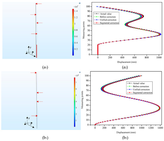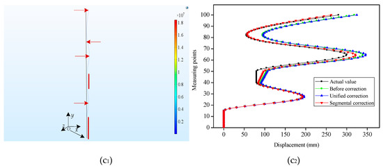 Considering the practical engineering application, for the task of internal horizontal displacements monitoring in the slopes, the displacements to be measured sometimes cover a long-distance range in the vertical direction. To simulate this circumstance, a slender plate model of epoxy resin material with a length of 10,000 mm, width of 10 mm and thickness of 2 mm was also simulated. Its bending shapes were represented in Figure 6a1,b1,c1. For Type 4 (Figure 6a1), 1000 mm, 500 mm, 750 mm and 50 mm displacements were applied along the x-axis at (−1, 4000, 0), (−1, 6000, 0), (−1, 8000, 0) and (−1, 10,000, 0) on the slender plate model, respectively. Meanwhile, the displacements from the bottom to the 20-th measuring point were constrained and remained unchanged. For Type 5 (Figure 6b1), we applied 1000 mm, 100 mm, 300 mm and 1000 mm displacements along the x direction at (−1, 2000, 0), (−1, 5000, 0), (−1, 6500, 0) and (−1, 10,000, 0), respectively. For Type 6 (Figure 6c1), the displacements of two regions (from the bottom to the 15-th measuring point and from the 40-th measuring point to the 50-th measuring point) were constrained to zero and 80 mm, respectively. Meanwhile, the displacements were imposed to the slender plate model at (−1, 2500, 0), (−1, 6500, 0), (−1, 7500, 0) and (−1, 10,000, 0) along the x direction, respectively, and the displacement values were 180 mm, 300 mm 120 mm and 280 mm, respectively.