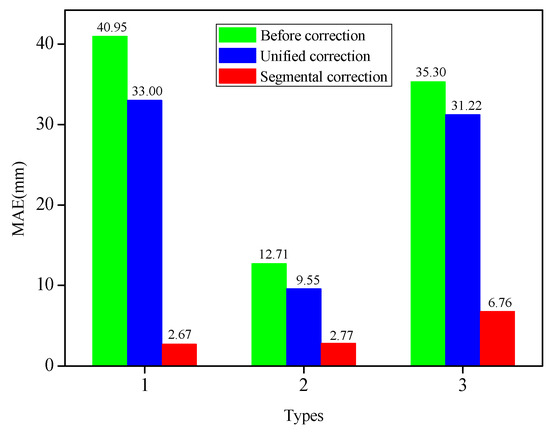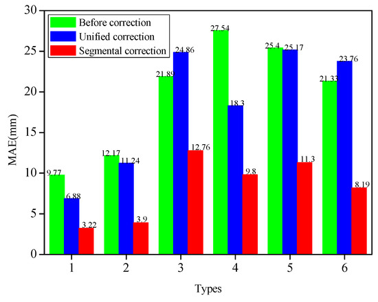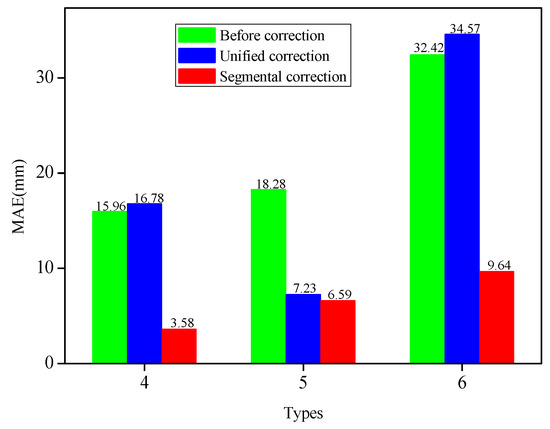 Figure 7 depicted the MAEs of the measuring points under three modes of initial reconstruction, unified correction and segmental correction. The extracted strain values for each bending shape were corrected by the unified coefficient, and the MAEs of the measuring point demonstrated larger differences. For instance, for Types 1, 2, 4 and 5, the MAEs of the corrected measuring points were decreased by 2.89 mm, 0.93 mm, 9.24 mm and 0.23 mm, respectively, compared with those before the correction. Nevertheless, for Types 3 and 6, the MAEs of the measuring points were augmented by unified corrections, which were 2.97 mm and 2.43 mm, respectively. Therefore, this fully testified to the fact that it was not competent to use the unified correction method to correct different bending shapes. However, the absolute errors of the six bending shapes had been determined to decline significantly after the strain values of different deformation segments for each bending shape were corrected by the segmental coefficients. The MAEs of Types 1, 2, 3, 4, 5 and 6 after the segmental corrections were 3.22 mm, 3.90 mm, 12.76 mm, 9.8 mm, 11.3 mm and 8.19 mm, respectively. The MAEs had dwindled by 6.55 mm (Type 1), 8.27 mm (Type 2), 9.13 mm (Type 3), 17.74 mm (Type 4), 14.1 mm (Type 5), and 13.14 mm (Type 6), respectively, following the segmental corrections. The segmental correction coefficients determined by Types 1, 2, and 3 were also applied to Types 4, 5, and 6 with good correction performances. The segmental coefficients correction showed its advantages in correcting the displacement errors of the measuring points with different bending shapes when compared with the unified coefficient correction. These findings indicated that the segmental correction method had the ability to improve the displacement accuracy of the measuring points with different bending shapes, which confirmed that it was necessary and feasible to use segmental correction for the various bending shapes.