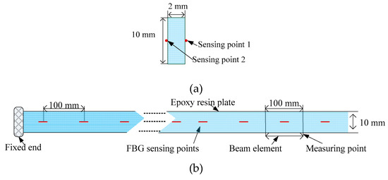 The flexible plate was divided into 19 beam elements by the FBG sensing points. When the flexible sensor was bent, the sensing point 1 and sensing point 2 (see Figure 8a) would respectively be stretched and compressed because the sensing points were symmetrically placed on both sides of the beam element. Thus, the bending-induced wavelength shifts of the two sensing points were identical in the opposite direction. Meanwhile, the temperature-induced wavelength shifts demonstrated the same direction. Therefore, the strain differences between the two sensing points on each beam element were used to eliminate the influence of the temperature. Then, the strain value could be calculated as: