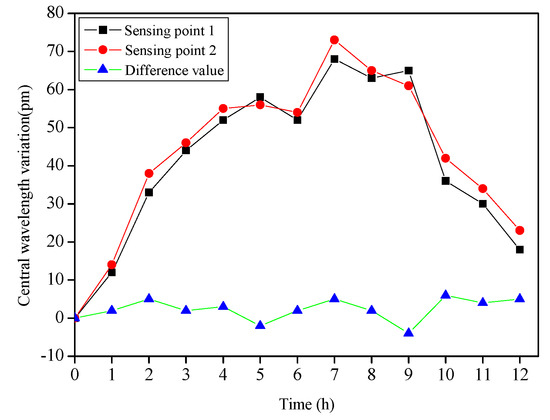 In engineering applications, the FBG flexible sensor is buried inside the slope, and the temperature around the sensor varies greatly throughout the year. Therefore, it is required for the sensor to have the ability to conduct a temperature self-compensation to avoid measurement deviations caused by temperature. A temperature sensing experiment was performed at room temperature for the fabricated FBG flexible sensor. The sensor was in a free state, and a four-channel FBG demodulation instrument SM130 (MOI) was employed to collect the central wavelength of each sensing point, whose wavelength measurements ranged from 1510 nm to 1590 nm with a demodulation precision of 1 pm. The central wavelengths of all FBG sensing points were recorded in real time from 8 a.m. to 8 p.m. The central wavelength variations of two sensing points on one of the beam elements were shown in Figure 9. The central wavelength maximum variations of the sensing point 1 and sensing point 2 were 68 pm and 73 pm, respectively. It was evident that temperature fluctuations could cause measurement errors. However, the differences of the central wavelength variations between the two sensing points were concentrated near zero, and the maximum fluctuation was only 6 pm. In addition, the maximum fluctuation values of the difference between the central wavelength variations of the two sensing points on the other beam elements were in the range of 10 pm. Therefore, it could be considered that the flexible sensor achieved an excellent performance in terms of temperature self-compensation.