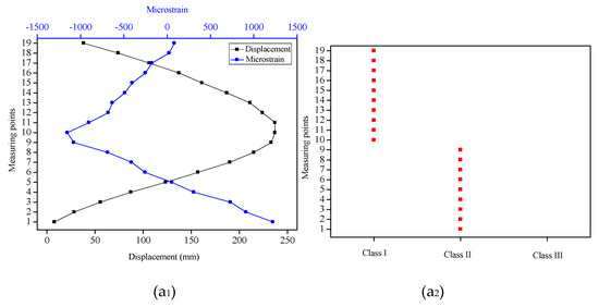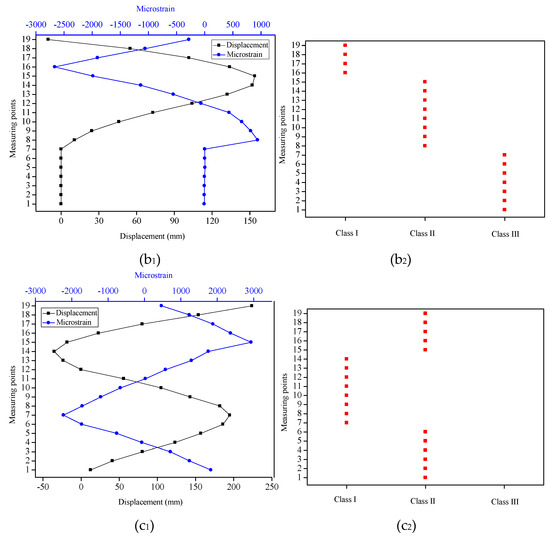 The displacements of the measuring points and micro-strains of the sensing points for three types and the clustering results. (a1), (b1) and (c1) represented the displacements and strains for Type 1, Type 2 and Type 3, respectively. (a2), (b2) and (c2) represented the clustering results for Type 1, Type 2 and Type 3, respectively.