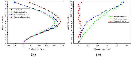 It was obvious that the initial reconstructed displacements of the measuring points had larger errors for each type (see Figure 15a2,b2,c2). The absolute errors had gradually increased, and the maximum absolute errors had all occurred to the 19-th measuring point (for example: 38.13 mm, 42.56 mm and 74.62 mm). The MAEs calculated by the initial reconstruction, along with the two correction methods, were depicted in Figure 16. Following the unified coefficient correction, the MAEs of corrected measuring points were decreased by 11.05 mm for Type 5. On the contrary, for Types 4 and 6, the MAEs of the measuring points were raised by unified corrections, which were 0.82 mm and 2.15 mm, respectively. Therefore, this exposed the inefficiencies of using a unified correction coefficient to correct the different bending shapes. The absolute errors of each type had been significantly reduced following the segmental coefficients. The MAEs of Types 4, 5 and 6 were 3.58 mm, 6.59 mm and 9.64 mm, respectively, following the segmental corrections. The MAEs had dwindled by 12.38 mm (Type 4), 11.69 mm (Type 5), and 22.78 mm (Type 6), respectively. Consequently, the segmental correction method and the correction coefficients determined by Types 1, 2 and 3 have also achieved favorable performances in the displacement errors correction of the measuring points in Types 4, 5 and 6. For each type, the displacement of each measuring point was Xi, with i = 1, 2, ..., 19. The mean absolute displacement x of the measuring points was . The MAE percentage can be calculated by MAEs/x × 100%. The MAE percentages of the measuring points based on different methods under six bending shapes were reflected in Table 3. The MAE percentages of Types 1, 2, 3, 4, 5 and 6 after segmental corrections were 1.87%, 5.28%, 6.98%, 7.62%, 4.16% and 8.31%, respectively. The MAE percentages had been declined by 26.83% (Type 1), 18.94% (Type 2), 29.49% (Type 3), 26.35% (Type 4), 7.39% (Type 5), and 19.65% (Type 6), respectively, following the segmental corrections. The MAE percentages of each bending shapes were observed to be relatively low.