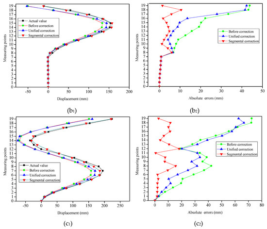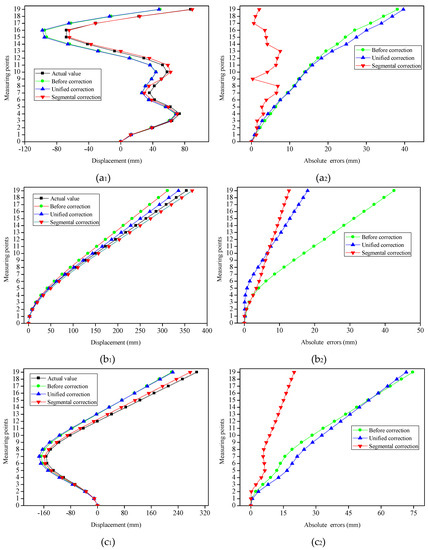 It has been pointed out that the displacements at different depths of the slopes are extremely complex during the evolution process of landslides because of the double influences of natural factors and anthropogenic activities. The bending shapes of the flexible sensor have diversified characteristics in the slope measurement. To verify the scalability of the segmental correction method, three other typical bending shapes of the FBG flexible sensor have been also executed in the scalable experiment. Both the segmental correction coefficients (k1 = 0.85 and k2 = 1.18) and the unified correction coefficient (k0 = 1.08) that had been determined in the above experiment were adopted in the comparison of the displacements sensing. Type 4 (Figure 15a1) included middle landslides and deep landslides, and the shallow layer produced a reverse horizontal displacement influenced by rainfall. To realize the bending shapes of the flexible sensor for Type 4, 73.78 mm, 36.07 mm, 29.14 mm, −67.96 mm and 87.49 mm displacements were imposed to the flexible sensor at (0, 400), (0, 700), (0, 1200), (0, 1600) and (0, 1900) along the x direction, respectively. The overall slip of slope body occurred in Type 5 (Figure 15b1). Thus, we applied a 149.56 mm displacement along the x-axis at (0, 1000). For Type 6 (Figure 15c1), landslides occurred in the shallow layer and middle layer. Meanwhile, it engendered a reverse horizontal displacement in the deep layer due to the groundwater being affected. In order to achieve this goal, the displacements were exerted on the sensor at (0, 600) and (0, 1200) along the x direction, respectively, and the displacement values were −149.89 mm and 0.36 mm, respectively. Repeated experiments were performed three times for each bending shape, and the average data were taken. Figure 15 displays the contrast of the displacements sensing under four modes (actual value, initial reconstruction, unified correction and segmental correction), as well as the absolute errors of the measuring points before and after the corrections.
