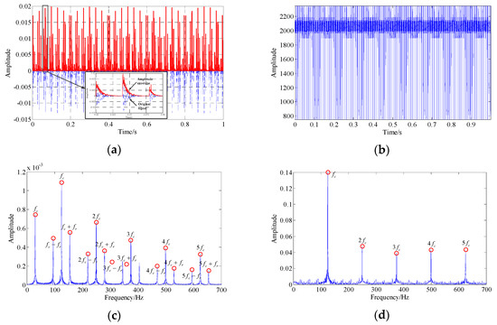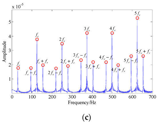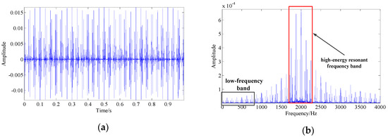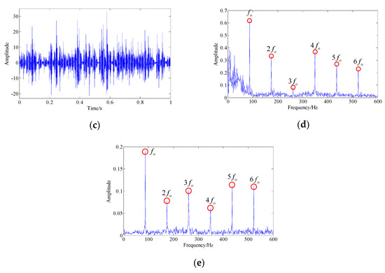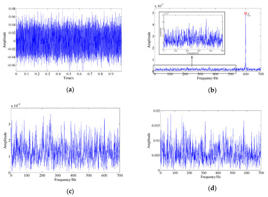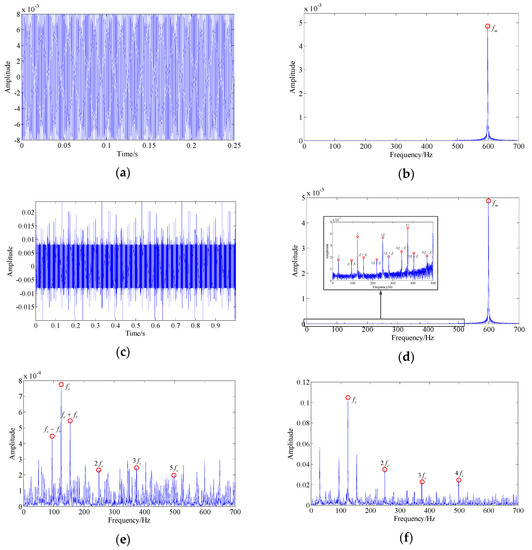 A common method used to diagnosis the bearing fault is to detect the appearance of the peaks at the location of the fault-related frequencies in the signal spectrum. Figure 1 shows the waveform and spectrum of a simulated fault characteristic signal of the bearing inner race. It can be observed that the AM/FM effects increase the spectral complexity of the signal, and there is a high-energy resonance frequency band around the system’s resonance frequency ( Hz) in the spectrum. In contrast, the energy in the low-frequency band is shown in Figure 1c, where the fault-related frequency (the rotation frequency of the shaft , the fault characteristic frequency , its first few harmonics – and their combination –) locations are extremely weak and are easily drowned out by noise and interference, resulting in difficulty detecting and locating the bearing fault.