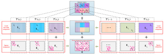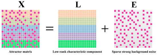 Apparently, is composed of multiple characteristic components and background noise. It is generally accepted that the characteristic component of matrix data is distributed on a low-dimensional sub-manifold in the high-dimensional phase space. RPCA is a commonly used method of dimension reduction analysis, which supports the characteristic component having a low rank structure [27]. Meanwhile, the noise can be suppressed by constructing a penalty function regularization. Videlicet, RPCA can robustly separate into a low-rank component and a sparse component by solving the following regularized rank minimization model (shown as Figure 5):