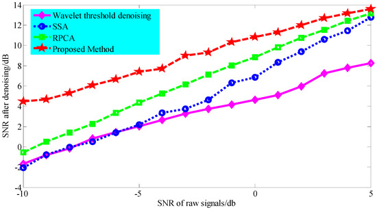We first investigated the robustness of the proposed LLORMA-based signal decomposition method to the background noise. To simulate the early stage of bearing fault development, strong background noise with an SNR ranging from –10 to 5 db was added to simulate a multi-component signal, which completely drowned out the signal characteristic information. The methods of wavelet threshold denoising, SSA, and RPCA were selected as comparative analysis methods. During wavelet threshold denoising, the decomposition layer was selected to be 3, and the wavelet basis function was set as “db15”. SSA uses the hard threshold method [43] to select the singular subspace. The parameters of RPCA are consistent with the proposed method. Figure 8 shows the SNR of the signal after denoising via the above four methods. In the vertical axis, a larger value of SNR after denoising means a better denoising performance. Obviously, the denoising performance of the proposed method is superior to that of other methods.