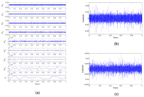 The demodulation analysis technique based on LMD and energy separation was employed to make a comparison analysis. The waveforms of eight PF components and the residual obtained by LMD are shown as Figure 9a. By estimating the instantaneous frequency and amplitude envelope of each PF via the energy separation algorithm, it was found that the instantaneous frequency waveforms of PF2 and PF3 fluctuated around the system’s resonance frequency, as shown in Figure 9d,e. The Fourier transform was applied to the amplitude envelope and instantaneous frequency of these two PFs to obtain the envelope spectra and instantaneous frequency spectra, as shown as Figure 9f,g,h,i, respectively. For PF2, fault-related frequency peaks were found in the envelope spectrum, i.e., the rotation frequency (), fault characteristic frequency (), its harmonics (–) and their combinations (–)., and , were found in the instantaneous frequency spectrum. For PF3, only parts of the fault-related frequency peaks appeared in the result spectrum. However, there were still many interference peaks and strong background noise in the spectrum, which seriously affected the final diagnosis result. This particularly occurred in instantaneous frequency spectra where the fault-related characteristic frequencies were hard to identify. The above discussion results demonstrate that although LMD has a certain effect on decomposing multi-component signals into single components, it cannot provide good denoising performance. Therefore, this technique was shown to be insufficient for fault diagnosis of the simulation signal in this experiment.