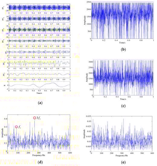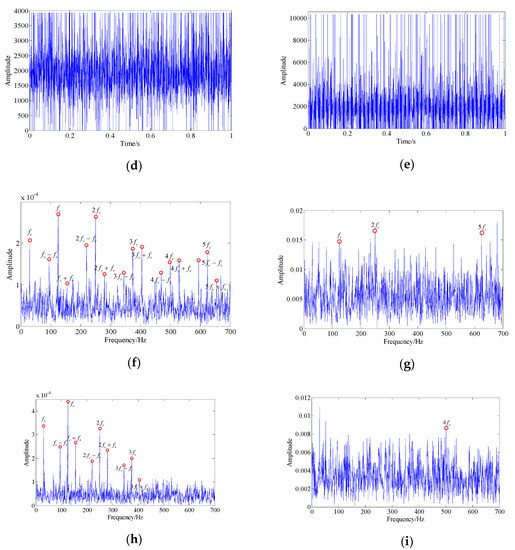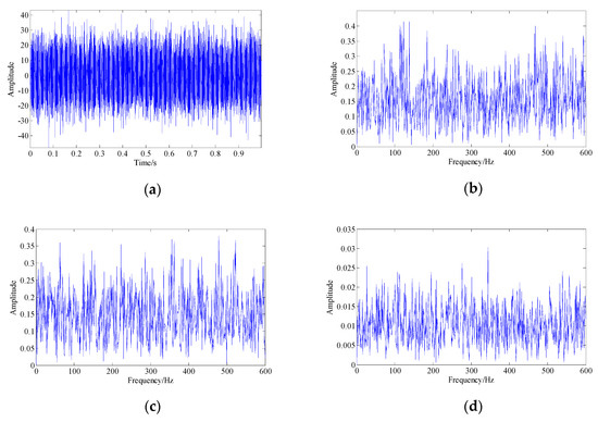 Then, the performance of the proposed joint demodulation technique was studied. We tested the noise–signal mixture with an SNR of –10 db, as shown in Figure 4, where the fault characteristic spectrum contents were completely submerged by interference signal and noise.