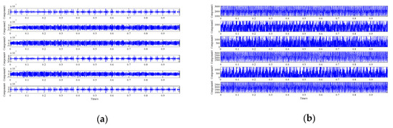 We used the proposed demodulation analysis technique to address the simulation signal. Primarily, the signal was decomposed by the proposed signal decomposition method. Six low-rank matrices were obtained via Algorithm 1, and their corresponding one-dimensional single-component signals waveforms are shown in Figure 10a. Figure 10b displays the instantaneous frequency waveforms of these component signals. It can be observed that the instantaneous frequency waveforms of components 1, 4, and 6 fluctuate around the system’s resonance frequency, while the others fluctuate around the characteristic frequency of the interference harmonic signal. Therefore, we combined the low-rank matrices corresponding to components 1, 4, and 6 into a one-dimensional signal to represent the extracted fault characteristic signal, and we combined the other low-rank matrices to represent the extracted interference harmonic signal. Figure 10c,d show the waveforms of these two extracted signals, respectively. Table 2 lists the correlation coefficients between these two extracted signals and between the six one-dimensional single-component signals and the raw two characteristic signals, respectively. We can observe that the similarity between these component signals or the two extracted signals and their corresponding original characteristic signals is very high. Hence, these analysis results verify the decomposition performance of the proposed LLORMA-based signal decomposition method.