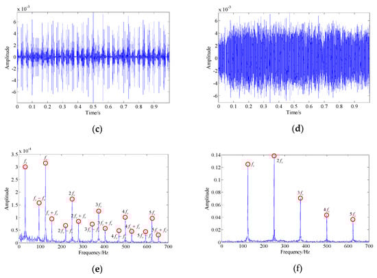 However, this algorithm can only handle single-component signals, while measured bearing vibration signals are generally composed of multiple components. Especially in the early stages of bearing fault development, the intensity of interference vibration caused by other mechanical components, such as gear meshing, compared with the weak bearing fault vibration, is usually substantial. In order to study the influence of interference components on the demodulation results of this algorithm, a low-frequency ( Hz), large-amplitude, single-harmonic signal was added to the signal shown in Figure 1. Figure 3a,b show the waveform and spectrum of this harmonic signal. The waveform and spectrum of this multi-component signal are shown in Figure 3c,d. The fault-related frequencies (see the close-up view) are almost invisible. Figure 3e,f illustrate the envelope spectrum and instantaneous frequency spectrum of this multi-component signal. It can be observed that there are a lot of unexplainable spectral components in the spectrum, which interfere with the discrimination of fault-related frequencies.
