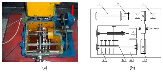 Bearing-gear fault test rig: (a) physical diagram; (b) structural diagram (1—AC motor; 2—coupler; 3—faulty bearing; 4—belt pulley; 5—gearbox; 6—transmission shaft; 7—gear sets).