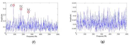 Next, the amplitude envelope and instantaneous frequency of the extracted fault characteristic signal were estimated via the energy separation algorithm, and then the Fourier transform was applied to both of them. Figure 10e,f reveal the obtained envelope spectrum and the instantaneous frequency spectrum, respectively. In the envelope spectrum, almost all of the fault-related locations appear as peaks, i.e., the rotation frequency (), the fault characteristic frequency (), its harmonics (–), and all of their combinations (–). In the instantaneous frequency spectrum, and its harmonics (–) are very prominent. Moreover, there is almost no interference frequency peak and the background noise is suppressed at a fairly low level. So, we can confirm the fault of the simulated signal. The above simulation experiment results demonstrate that the proposed technique scheme can effectively eliminate the noise and extract the fault characteristic component from the multi-component signal, so it has an excellent diagnostic performance for the simulated signal.