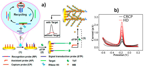 Wang et al. [20] proposed a versatile electrochemical biosensor, using a dual enzyme assisted multiple amplification strategy for the ultrasensitive detection of KRAS G12DM ss-ctDNA. The biosensor involved the use of molecular recognition (a triple helix molecular switch, THMS), and signal transduction probes. Furthermore, the terminal deoxynucleotidyl transferase (TdT) and ribonuclease HII (RNase HII) dual enzyme assisted multiple amplification to form a dendritic structure (see Figure 1a). The presence of target ctDNA opened the THMS and triggered Rnase HII-assisted homogenous target recycling amplification to produce a substantial signal transduction probe (STP). The released STP, hybridized with the capture probe, was immobilized on a gold electrode and triggered the first-step TdT-mediated extension to form the DNA “trunk”. Then, the specially designed assistant probe (AP), which partially hybridized with the DNA “trunk”, was further introduced to initiate the second-step TdT-mediated extension and generated a long stable DNA dendritic structure, which would be decorated with a high number of methylene blue (MB) molecules, used as signal reporters, producing a significant amplification in the electrochemical response. Using as analytical readout the MB DPV oxidation peak, and combining the efficient recognition of the designed THMS with the excellent multiple amplification ability of Rnase HII and TdT, this sensing platform was able to determine synthetic KRAS G12DM target DNA over the wide range 0.01 fM-1 pM, with a limit of detection (LOD) of 2.4 aM. The biosensor was applied to determine ctDNA in DNA extracted from plasma of colorectal cancer patients (CRCP) and healthy donors (HD). DPV traces, shown in Figure 1b, confirmed the higher expression of the KRAS G12DM in the CRCP plasma with mean concentrations of 0.19 fM and 11.59 aM in plasma from CRCP and HD, respectively. Importantly, this biosensing strategy can be readily extended to detect a wide range of ctDNA simply by substituting the THMS loop for different sequences.