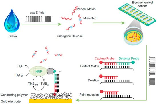 Wei et al. [21] proposed the use of electric field–induced release and measurement (EFIRM) technology, in connection with a multiplexed electrochemical biosensor, for the determination of epidermal growth factor receptor (EGFR) mutations in the saliva and plasma of non-small cell lung carcinoma (NSCLC) patients. The method used cyclic-square waves of the electrical field (csw E-field) to release the genetic material from the biofluid. The determination involved a sandwich hybridization format with paired capture and detector probes specific for the two target mutations detected (exon 19 deletion and L858R point mutation). The capture probe-modified electrochemical sensor consisted of a conducting polymer-based electrochemical chip with an array of 16 bare gold electrode chips). After labeling the fluorescein isothiocyanate (FITC)-modified detector probe with Fab fragments from an anti-fluorescein antibody conjugated to horseradish peroxidase (HRP-anti-FITC Fab fragments), the chronoamperometric signals were measured in the presence 3,3´,5,5´-tetramethylbenzidine (TMB) and H2O2 at -200 mV versus the Au pseudo-reference electrode (Figure 2). It is remarkable that this method required less than 10 min, and just 20-40 µL of biological sample, to perform the determination.