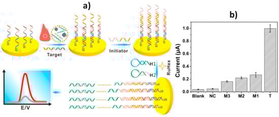Yang et al. [24] reported another DNA electrochemical sensor for BRCA1 using hybridization chain reaction (HCR) (Figure 3a). HCR is as an isothermal amplification methodology, which does not require complicated variable temperature programs nor the participation of enzymes. It uses two supplementary nucleic acid probes (H1 and H2), which can steadily coexist in solution with no initiator probe, but their loops are alternately opened to form dsDNA when the initiator is present [33]. The DPV signal of RuHex, used as electrochemical redox indicator provided a linear correlation with the logarithm of the target sequence concentration between 1 aM and 10 pM with a LOD of 1 aM. In addition, this HCR-based DNA sensor was able to discriminate a single mismatched sequence (M1 in Figure 3b) and to detect low concentrations of the target synthetic DNA (10 pM) in spiked 50% human serum.