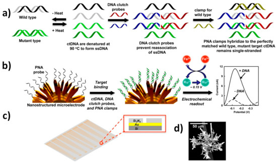 An attractive electrochemical assay, able to directly detect mutation within KRAS and BRAF in ctDNAs, from serum of cancer patients with no need for enzymatic amplification, has been proposed by O. Kelley group [25]. This approach employed a peptide nucleic acid (PNA) wild-type blocker, together with DNA “clutch probes” (DCPs), which are pairs of ssDNA molecules that hinder the re-association of denatured ssDNAs. In this way, one of the two strands in dsDNA molecules was available for hybridization, and deactivated strongly correlated sequences available in solution, thus promoting preferential association of mutated sequence-based hybridization events, with finely nanostructured microelectrode (NME), functionalized with allele-specific PNA probes (Figure 4). The NME was prepared using a SiO2-coated silicon wafer to construct contact pads and electrical leads. Then, a Si3N4 layer was placed, in order to passivate the surface and 5 μm apertures. These were then opened in the top passivation layer by photolithography to supply a template for the growing of electrodeposited Au. The as-formed Au structures were then coated with a thin layer of Pd. The three-dimensional nanostructure of the NME allowed the probes to have an adequate alignment direction, thus increasing the hybridization efficiency. After target hybridization, the biosensors were interrogated, using an electrocatalytic reporter pair of Ru(NH3)63+ and Fe(CN)63−, by DPV. The voltammetric response increased in the presence of the target mutant. Ru(NH3)63+ was electrostatically attracted to the negatively-charged phosphate backbone of nucleic acids that binds to the probes immobilized on the surface of electrodes, and was reduced to Ru(NH3)62+ when the electrode was biased at the reduction potential [34]. The Fe(CN)63−, present in solution, chemically oxidized Ru(NH3)62+ back to Ru(NH3)63+, which allowed for multiple turnovers of Ru(NH3)63+ and generated a high electrocatalytic current (Figure 4c). The method was able to distinguish 1 fg μL−1 of a selected mutation within 100 pg μL−1 of wild-type DNA, i.e., it detected 0.01% mutations and allowed for the accurate analysis of ctDNAs, extracted from serum samples, that were collected from lung cancer and melanoma patients.