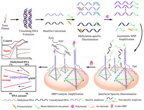 The electrochemical analysis of circulating methylated DNA in plasma was proposed by Chen et al. [26], implementing a paired-end tagging amplifications strategy. Two DNA primers, each labeled with digoxigenin (Dig) and biotin, were designed for the recognition and amplification of methylated DNA. Paired-end tagging amplicons and avidin-HRP molecules were successively captured on the electrode surface, modified with anti-Dig antibody, and chronoamperometric detection was carried out in the presence of TMB/H2O2. The method allowed the detection of as little as 40 pg of methylated genomic DNA, 1% methylation level, and tumor-specific methylated DNA in plasma of NSCLC patients, attaining a very high clinical sensitivity of 91%.