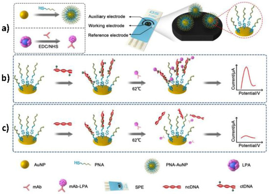Schematic displays showing the preparation of PNA-AuNPs conjugates and LPA-anti-5-mC bioconjugates (a) and the ctDNA (b) and ncDNA (c) detection at the constructed biosensor. Reprinted and adapted from [31] with permission.