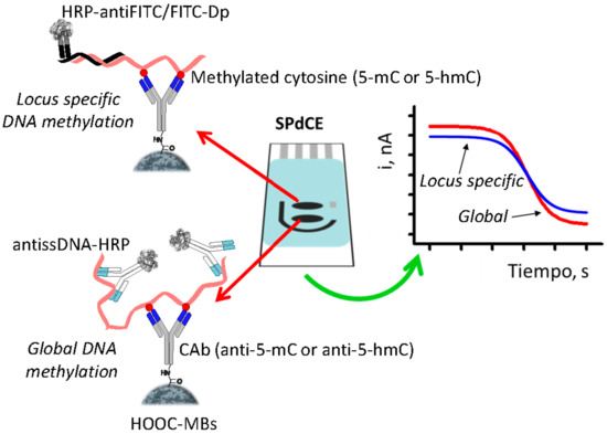 Other simple and rapid strategies, not involving nanomaterials or nucleic acid-based amplification strategies, have been devised for the sensitive and selective detection of methylated ctDNA, such as those developed by Pingarrón´s group for the detection of 5-mC or 5-hmC, both at global and locus-specific levels. The strategies leant on the combination of functionalized magnetic microbeads (MBs), antibodies specific for the target methylated cytosines, and were used either to capture or detect the methylated DNA, specific biotinylated DNA probes, and amperometric detection at screen-printed carbon electrodes [29,30]. The developed methodologies achieved LODs of 0.43 and 1.2 pM for the synthetic 5-hmC, and 5-mC sequences of the MGMT tumor suppressor gene promoter region, respectively, in 45–90 min with a great reproducibility [30]. These bioplatforms were applied for the first time to the dual detection of the same or different kinds of epimarks both, at a global level and in different regions/loci of the same gene, or in different genes by using screen-printed dual carbon electrodes. Figure 7 shows that the assays included the effective capturing of the methylated ssDNA to MBs, modified with antibodies specific to the target epimark. The captured methylated DNA was labeled with a HRP-conjugated antibody, capable in detecting any ss-DNA sequence for global methylation, or with a fluorescein-5-isothiocyanate (FITC) labeled detector DNA probe, specific to the target methylated gene, and followed by conjugation with HRP-anti-FITC Fab fragments for locus-specific methylation. The developed bio-platforms were used for the determination of 5-mC methylations in the promoter region of RASSF1A gene, directly in serum samples from breast and lung cancer patients [30].