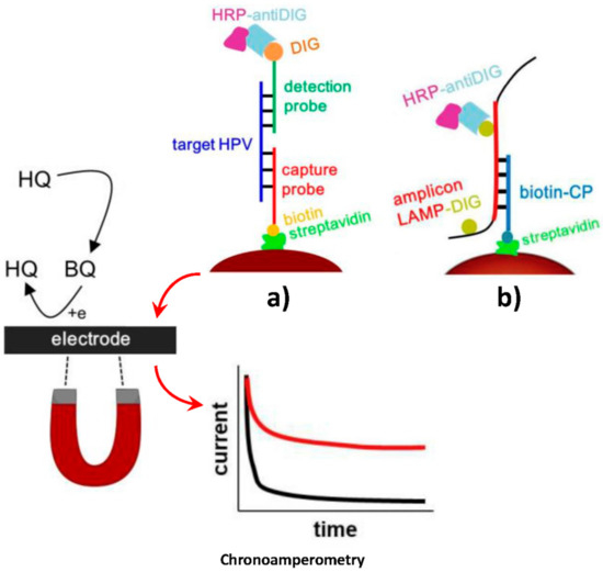 Bartosik et al. [38] developed attractive MBs-based biosensing strategies for the detection of DNA sequences of HPV-16 and HPV-18, two of the most carcinogenic high-risk human papillomavirus (hrHPVs), which are responsible for about 70% of all cervical tumors. The approaches were implemented in connection with PCR [28] and loop-mediated isothermal amplification (LAMP) [38]. Both strategies involved the use of Strep-MBs, modified with a biotinylated DNA capture probe, to hybridize the synthetic target HPV DNA (Figure 8a) or the resulting amplicon (PCR or digoxigenin (DIG)-labeled LAMP one (Figure 8b). Once captured, the target DNA or the corresponding amplicon was sandwiched with a DIG-labeled detector probe. In both methods, enzymatic labeling was made with HRP-antiDIG antibody. Upon magnetic capturing of the modified MBs, the electrochemical transduction was performed by chronoamperometry, using the H2O2/HQ system, at a screen-printed electrochemical array comprising eight carbon electrodes. These methods yielded linear ranges from 1 pM to 1 nM, with a LOD of 1 pM, and from 0.1 to 50.0 ng and LODs of 0.1 and 0.7 ng, for the synthetic target DNA, and the DNA extracted from CaSki cells for the PCR, and LAMP-based methods, respectively. These MBs-involving biosensing strategies allowed the discrimination between these two hrHPVs and were used for the analysis of both, cancer cell lines and real patients’ cervical brush smears.