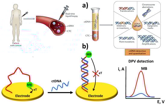 Schematic illustration of liquid biopsy, ctDNA and specific features (a) and a type of electrochemical DNA sensor for ctDNA determination (b). Figure reprinted and adapted from [12] with permission (a) and drawn based on [13] (b).