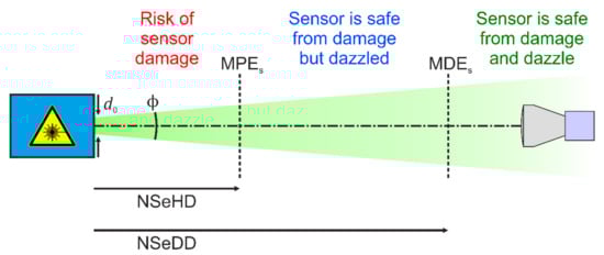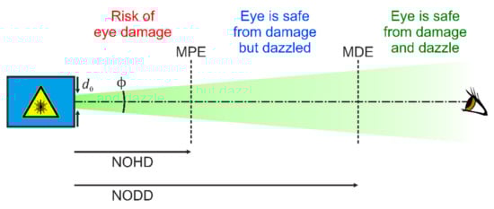 A lot of research was also done regarding laser dazzle of the human eye. This includes the modelling of laser eye dazzle [,] and the investigation of degradation of human performance in laser dazzle situations [,]. A highlight might be the work of Williamson and McLin, which have extended the traditional laser safety quantities of Maximum Permissible Exposure (MPE) and Nominal Ocular Hazard Distance (NOHD) to laser dazzle [,]. MPE and NOHD refer only to laser damage of the human eye. MPE is the maximum laser irradiance at the cornea of the eye that ensures safety from damage when looking into the direct laser beam. The distance to a laser source at which the laser irradiance dropped to the MPE, is called NOHD. This is illustrated in Figure 1.