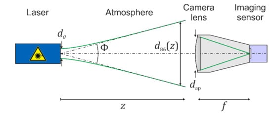 If the laser source is located far from the camera lens, the beam diameter at the position of the camera lens is much larger than the diameter of the lens aperture . In this case, we can assume that the irradiance distribution at the lens aperture is homogeneous and an Airy diffraction pattern will occur in the focal plane at the position of the imaging sensor. Here, we neglect that a real lens aperture may have a polygonal shape and assume a circular shape.