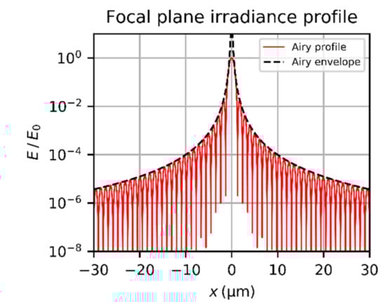 A typical irradiance profile of an Airy diffraction pattern according to Equation (7) is shown in Figure 3. The irradiance is normalized to the peak irradiance . For the calculations, a laser wavelength of and an wre used.