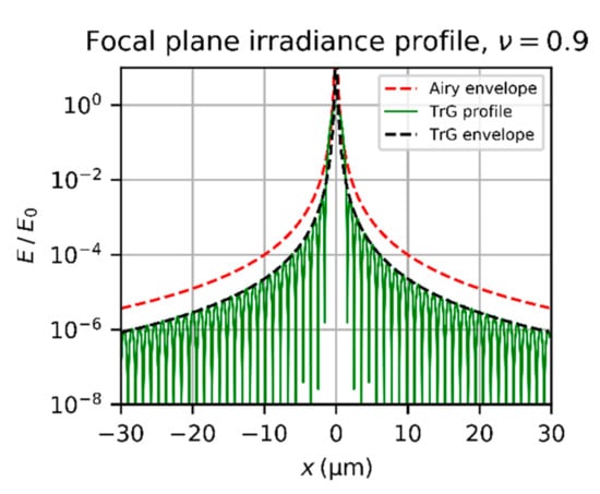 Normalized irradiance profile of an Airy diffraction pattern and its envelope according to Equation (7) and Equation (12), respectively. Calculation parameters: and an f-number of .