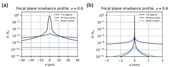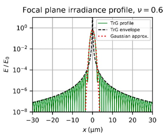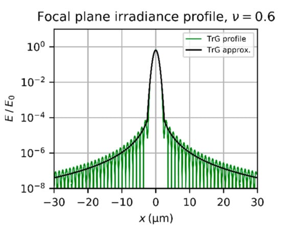 Irradiance profile of the diffraction pattern of a truncated Gaussian beam (TrG) and its approximation according to Equation (14) and Equation (23), respectively. Calculation parameters: , , , . The curves are normalized using the peak irradiance of an Airy diffraction pattern for same incident power .