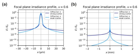where (m) is the radial coordinate in the focal plane and is the Bessel function of first kind []. The peak irradiance (W/m2) of the diffraction pattern at the focal plane is given by []