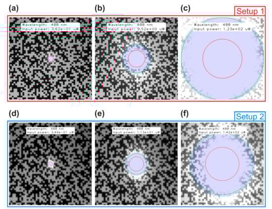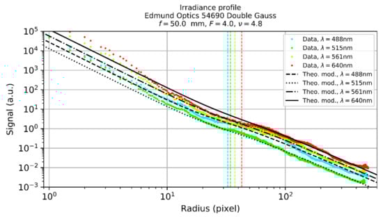 - As shown in Figure 3, the period of the oscillations of the irradiance profile is in the order of some micrometers (the radius of the first dark ring is ). The pixel size of most imaging sensors is typically larger than 3 µm. Thus, the camera image will show an averaged irradiance pattern.