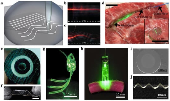 Biodegradable optical waveguides. (a) Schematic of direct printing of silk waveguides on borosilicate glass slides. Reproduced with permission [42]. Copyright 2009, Wiley; (b,c) Images of straight (b) and wavy (c) silk waveguides when a He-Ne laser source was launched. Reproduced with permission [42]. Copyright 2009, Wiley; (d) Light-guiding of silk waveguides in tissue. Reproduced with permission [44]. Copyright 2015, Optical Society of America; (e) Cross-section image of a biodegradable double-core optical fiber made from cellulose. Reproduced with permission [49]. Copyright 2007, Optical Society of America; (f) Mechanical flexibility of a polylactic acid (PLA) film. Reproduced with permission [51]. Copyright 2016, Nature Publishing Group; (g,h) Bioabsorbable PLA waveguide array for photochemical tissue bonding (PTB) treatment of porcine skin incision. Reproduced with permission [51]. Copyright 2016, Nature Publishing Group; (i) Cross-section image of a citrate-based optical fiber with poly(octamethylene maleate citrate) (POMC) core and poly(octamethylene citrate) (POC) cladding. Reproduced with permission [55]. Copyright 2017, Elsevier; (j) Photograph of a twisted citrate-based optical fiber around a glass tube, showing mechanical flexibility. Reproduced with permission [55]. Copyright 2017, Elsevier.