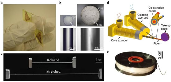 Soft polymer optical fibers are generally fabricated through a molding process, followed by curing and demolding, which are difficult to achieve for fibers at a large length scale (>100 m). To overcome this limitation, recent attempts have been made to produce optical fibers from thermoplastic elastomers due to their melt-processability [68,69,70]. Leber et al. reported scalable fabrications of highly stretchable, core-cladding optical fibers through a one-step coextrusion process (Figure 3d) [68]. The core and cladding were made of polystyrene-based polymer Star Clear 1044 (RI, 1.52) and fluorinated polymer Daikin T-530 (RI, 1.36), respectively. Following this approach, they fabricated fibers with 200 m length in one hour of continuous coextrusion (Figure 3e). The core-cladding fibers showed excellent mechanical flexibility and stretchability that could reversibly sustain large tensile strains of up to 300%. The propagation loss of these fibers was 0.8–1.2 dB/cm at visible wavelengths.