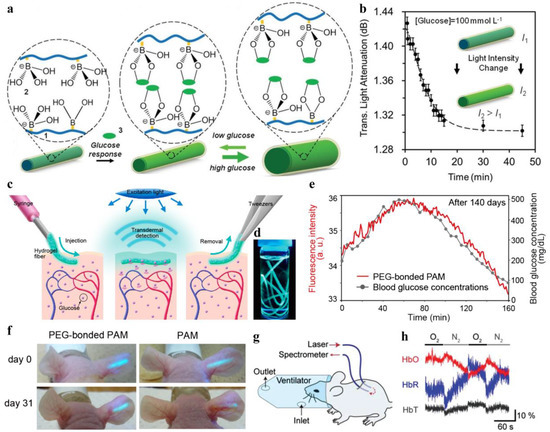 (a) Schematic diagram of a hydrogel optical fiber functionalized with 3-APBA for glucose monitoring. Reproduced with permission [40]. Copyright 2017, Wiley; (b) Intensity changes of the transmitted light through the glucose-sensitive fiber over time at a glucose concentration of 100 mmol L−1. Reproduced with permission [40]. Copyright 2017, Wiley; (c) Injectable fiber incorporated with fluorescent glucose-responsive monomer for long-term monitoring of blood glucose concentration in vivo. Reproduced with permission [73]. Copyright 2011, National Academy of Sciences; (d) Photograph of fluorescent fibers in a glass vial. Reproduced with permission [73]. Copyright 2011, National Academy of Sciences; (e,f) Implantation of fluorescent fibers in the ear of mice for glucose monitoring. Reproduced with permission [73]. Copyright 2011, National Academy of Sciences; (g,h) Two core-cladding hydrogel optical fibers implanted in mouse subcutaneous tissue to measure oxygenated and deoxygenated hemoglobin concentrations. Reproduced with permission [32]. Copyright 2015, Wiley.