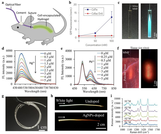 Furthermore, functional nanoparticles such as QDs and silver/gold nanoparticles could be incorporated into biocompatible waveguides through chemical bonding or physical entrapping, which endows the waveguides with new sensing functionalities. In recent work, researchers developed a carbon dots (CDs)-doped slab hydrogel waveguide for Hg2+ sensing (Figure 5c) [75]. The hydrogel waveguide served as a light-guiding platform, allowing laser excitation of the CDs and emission collection, while small Hg2+ ions could penetrate into the porous hydrogel matrices and quench the CDs. Coupled with standard silica optical fibers, they achieved selective and sensitive detection of Hg2+ from the fluorescence quenching, attributed to the nonradiative electron transfer of the incorporated CDs (Figure 5d). Fluorescence intensity-based sensing is susceptible to interferences such as fluctuations of the excitation laser power, changes of the surrounding environments, and instrumental efficiency. To minimize the analyte-independent effects, hydrogel waveguides doped with two types of QDs at different emission bands were demonstrated for ratiometric sensing of metal ions (Figure 5e) [76]. The ratiometric configuration offered a built-in calibration that makes the waveguide sensor robust to environmental perturbations. The feasibility of such QDs-doped waveguide for optical sensing in tissues has been tested (Figure 5f). In addition, hydrogel optical fibers have also been doped with silver nanoparticles (AgNPs) for in-su surface-enhanced Raman scattering (SERS) sensing (Figure 5g,h) [34]. The AgNPs-doped hydrogel optical fibers, having a Young’s modulus comparable to soft biological tissues, were demonstrated for detection and discrimination of bioanalytes from the SERS spectra (Figure 5i).