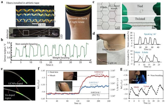 (a,b) Stretchable fiber-based strain sensor installed on an athletic tape to monitor weight-bearing activities. Reproduced with permission [70]. Copyright 2017, Wiley; (c,d) Dye-doped PDMS fiber developed for wearable strain sensing during speaking and deep breathing. Reproduced with permission [83]. Copyright 2017, Optical Society of America; (e) Photographs of upconversion nanoparticles (UCNPs)-doped fibers under 980 nm excitation. Reproduced with permission [64]. Copyright 2019, Wiley; (f,g) Demonstration of the UCNPs-doped fibers in real-time temperature monitoring of surface skin and interior mouth (f), as well as thermal signals generated by nose breathing (g). Reproduced with permission [64]. Copyright 2019, Wiley.