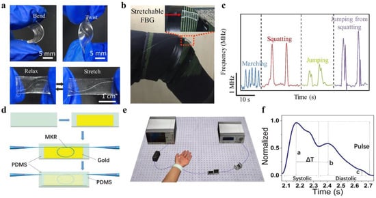 Furthermore, there have also been efforts to enhance flexibility and elasticity of conventional silica fiber-based sensors through material coating and structural designs for wearable applications. A stretchable fiber-optic strain sensor made up of a sinuous-shaped fiber-Bragg-grating (FBG) embedded in a slab PDMS substrate has been fabricated by using 3D-printed mold [84]. The sinuous-shaped structure of FBG enabled sensing of various deformations including tension, bending, and torsion from the Bragg wavelength shift (Figure 7a). Multiplexing capabilities of the FBG-based sensors have been explored by using a free-running fiber laser based on dual-comb spectroscopy. The stretchable sensor was attached to an elastic kneepad and applied for sports activities monitoring (Figure 7b,c). Li et al. reported a flexible optical microfiber sensor for strain and pressure detections by embedding a hybrid plasmonic microfiber resonator in a PDMS membrane (Figure 7d) [85]. The operating principle of the microfiber sensor for strain and pressure sensing was based on the shift of the resonating wavelength, ascribed to the changes of light polarization and photoelasticity of PDMS under mechanical deformations. The flexible microfiber resonator was worn on the human wrist to detect artery pulse, which is an important indicator of heartbeat and arterial blood pressure (Figure 7e,f). These results showed great promise for the optical devices in wearable heath monitoring and medicines.