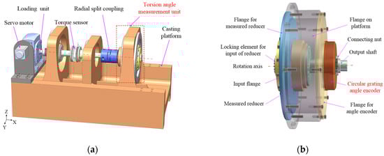 In this study, the structure of a TCMS for a precision reducer was developed, as shown in Figure 1a. The main structure of the system consisted of a casting platform, a torsion angle measurement unit, a torque sensor, a loading unit, a servomotor, and a control system for motion control and data acquisition. In order to meet the requirements of the multimodel precision reducer and improve measurement efficiency, a circular grating angle encoder (Heidenhain RON786-18000 with a radius of rotation of 30 mm, a resolution of 0.7 arcsec after subdivision, and a system accuracy of ±2 arcsec) was used in this system, and a simplified measurement process was designed. Firstly, the measured reducer, the output shaft, and the flange for the measured reducer were assembled into a corresponding relationship. Then, the above components were mounted on a flange fixed on the casting platform, and the output shaft and angle encoder were connected by a nut, as shown in Figure 1b.