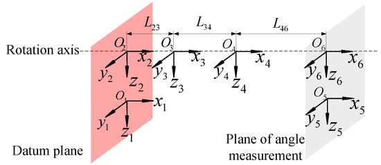 Based on the principle of homogeneous coordinate transformation, the feature matrix is used to describe the position coordinate transformation of the measurement point in each coordinate system. Assuming a measurement point in the output shaft coordinate system S4, a corresponding point can be obtained in the angle measurement coordinate system S6 after a series of coordinate transformations of the intermediate coordinate system. The transformation relationship of and can be expressed as