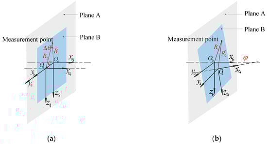 Based on the spatial coordinate system and angle measurement relationship established in the previous section, the angle measurement model was constructed under error, as shown in Figure 3. Under the impact of geometric errors, the position of the measuring point changes. The measurement plane in which the sensor is located is defined as plane A, and the plane of the measured point on the output shaft is defined as plane B. Ideally, the sensor and output shaft rotate about the x-axis. The traditional analysis method only considers the influence of the eccentricity error of the rotation axis. Moreover, the measurement model of the angle encoder under eccentricity error is shown in Figure 3a. The angular error can be expressed as []