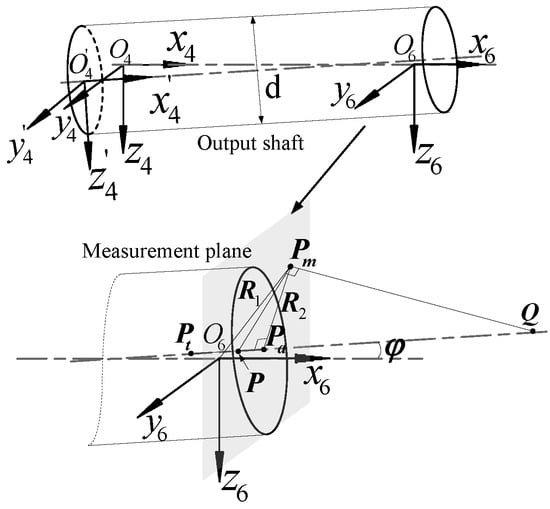 According to the measurement model proposed in Section 2, this subsection shows how we determined the relationship between the theoretical and actual measurement points based on the spatial geometry method []. Suppose Pt is the theoretical measurement point on the output shaft, P is the intersection of the actual rotation axis and the measurement plane, Pa is the actual measurement point on the output shaft, and the diameter of the output shaft is d. The coupling nut on the normal plane of the output shaft passes the point Pa, the intersection of the measurement plane is Pm, and PaPm = R2. The intersection point of the normal of the crossing point Pm and the actual output shaft on the measurement plane is Q, as shown in Figure 4.