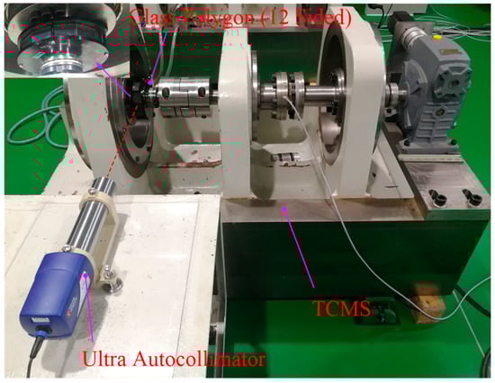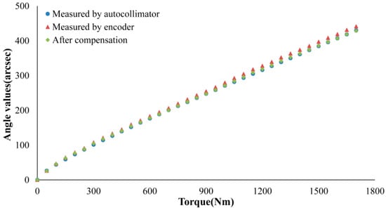 To validate the error compensation method, a calibration experiment was performed on the torsional characteristics measurement system, which is illustrated in Figure 6. In particular, an ultra-autocollimator with a 12-sided glass polygon (Taylor Hobson; the measuring range was 1800 arcsec, the resolution was 0.001 arcsec, and the accuracy over the total range was 0.2 arcsec) was used to measure the torsion angle when the loading actuator was loaded with the given value. The experiment procedure was as follows: