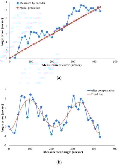 Figure 8a shows the difference between the actual error value and the model compensation value. The square dotted line indicates the actual error value, which is the difference of the measured values between the angle encoder and the autocollimator. The round dotted line indicates the compensation value of the error compensation model. It can be observed that the square and dotted lines had the same tendency when the angle increased, which indicates that the error compensation model was correct. In addition, the square line is slightly above the round dotted line and has significant sinusoidal periodic fluctuations, indicating that the actual error contained other error terms. In the actual situation, the compensation coefficient was a constant when the manufacturing error was determined. It can be seen from Figure 8a that the predicted error based on the model was linear. According to the error model, the measurement error of the angle sensor can be effectively reduced by analyzing the influence of manufacturing errors on the compensation coefficient and controlling the machining accuracy of the critical dimension of the components.
