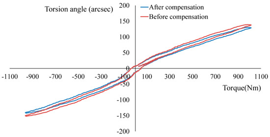 It can be observed from Figure 9 that the measured hysteresis curve is smooth and closed, indicating that the angle measured by the sensor was consistent with the actual torsion angle. On the other hand, the values of backlash were within the sample range and were consistent with the actual situation according to Table 5. The difference between the measured value after compensation and the sample value of the torsional stiffness was 3.13, 2.51, and 2.79 Nm/arcmin, respectively. The system measurement errors decreased by 8.3%, 9.2%, and 13.4% before and after angular error compensation, respectively. So, the measurement results have also validated the proposed error compensation method.