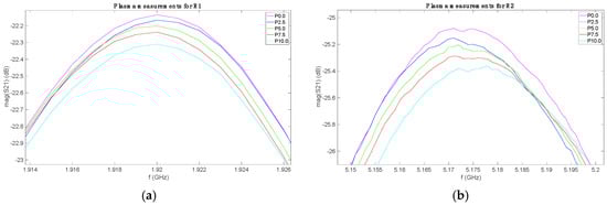 The measurements for each set with each sensor were plotted together, in order to identify the possible behavior. As an example, Figure 3 shows the S21 parameters for the measurements of the plasma set (P) with the three sensors. The solutions are labeled as Px.x, where x.x indicates the added glucose mass percentage in the plasma solution. The rest of sets presented similar behaviors. All the data are freely available in [47].